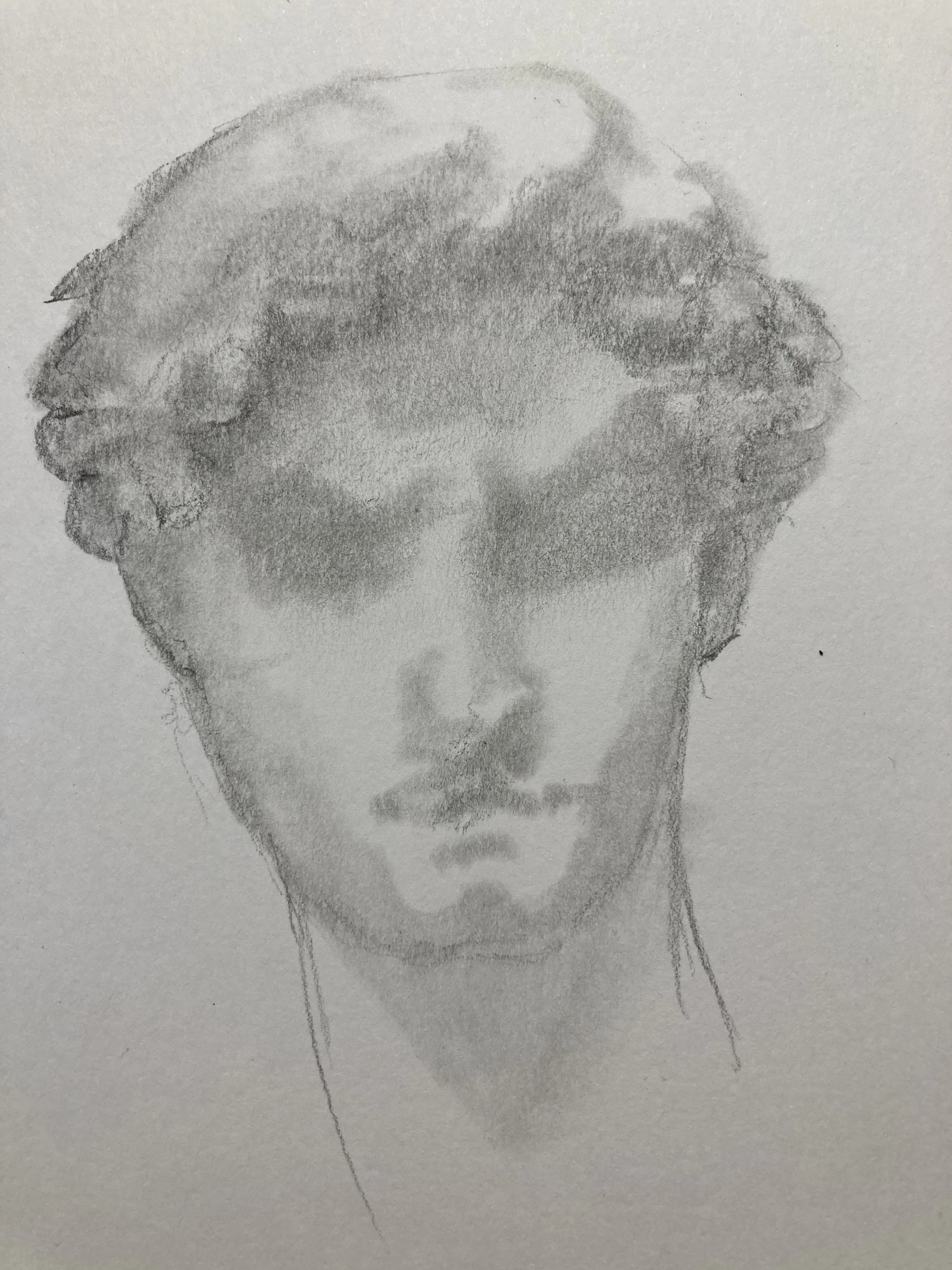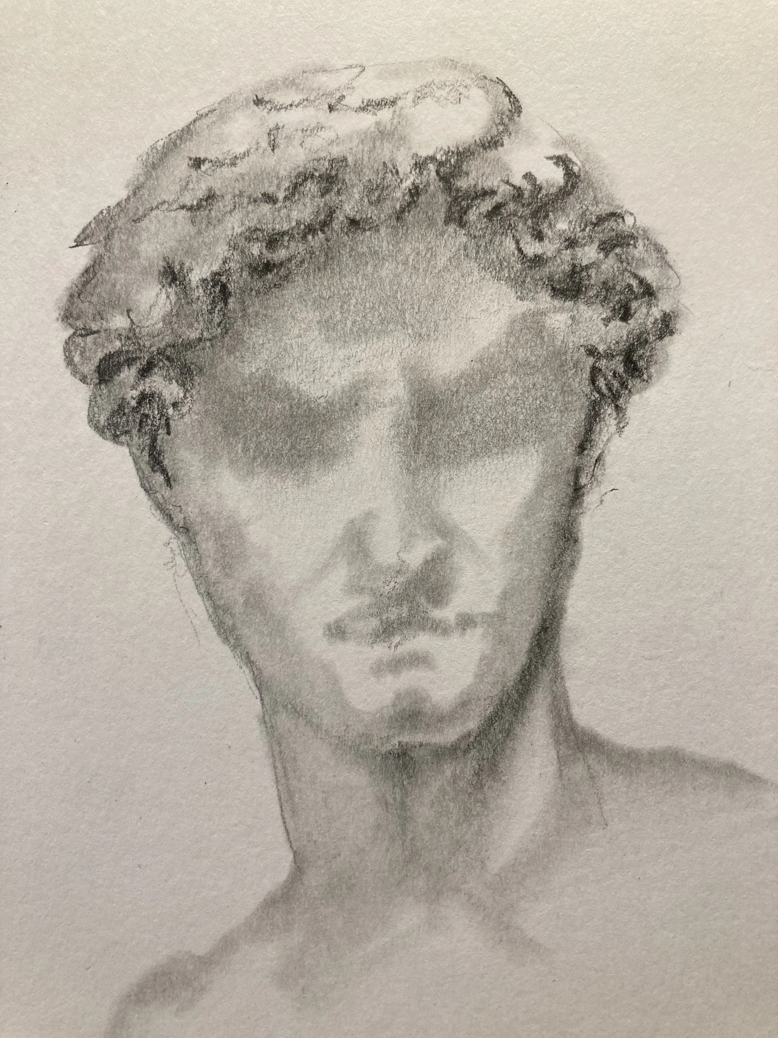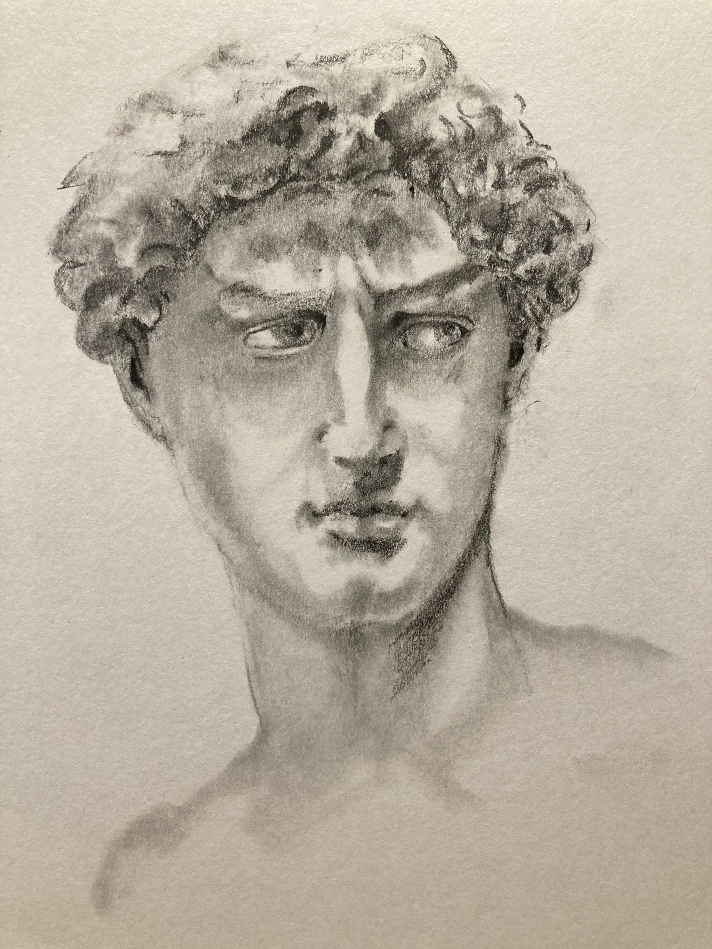 There are many ways you can draw a portrait. I won’t be teaching you all the ways for that’s an impossibility. I will just show you one way I do it, with warts (mistakes) and all, using a classical image of David, a sculpture made by Michaelangelo.