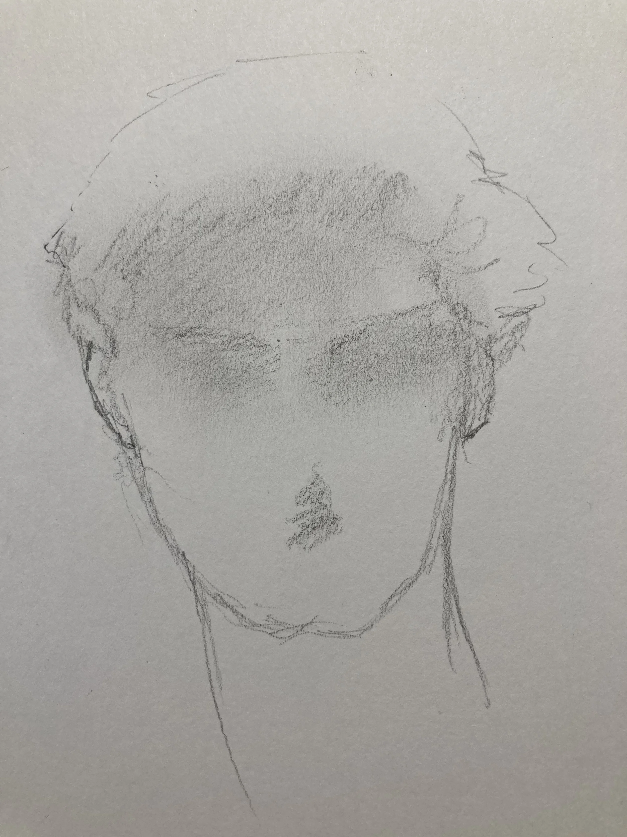 I started to smudge my pencil drawings to create bigger shapes that makes up the general medium dark values of the portrait like this, I use a blending stump or a tortillion to do this because it’s pointy tip makes blending darker shapes to medium dark more accurate. If you’re using your finger to blend, that’s okay too, but it doesn’t tend to be as good a point and your fingers can excrete more oil that would penetrate the drawing paper in a way you might not want.