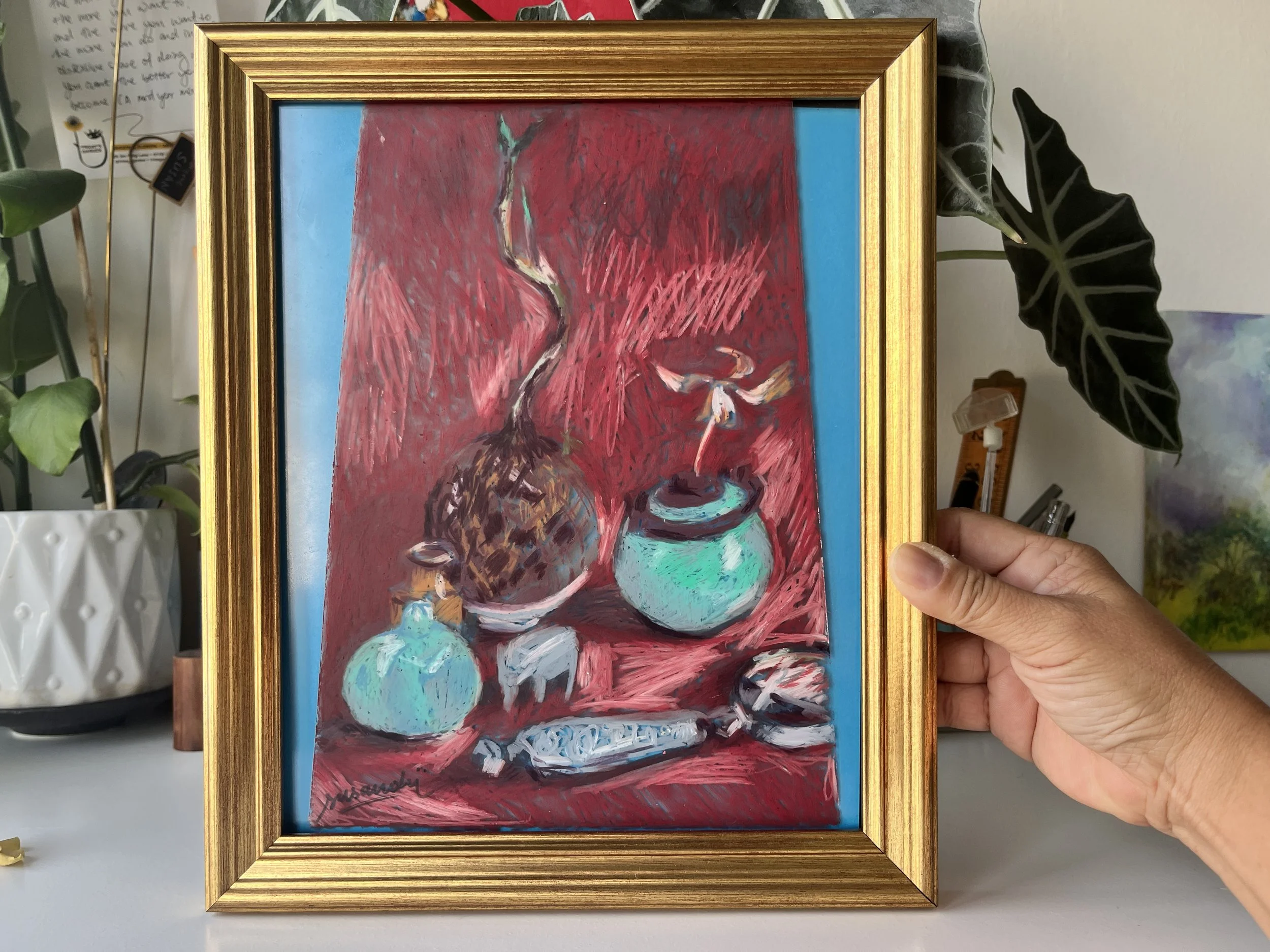 7. Done in wax neocolour crayon. It’s on Perspex and still life of my own objects that I love. The work is strongly representing my observation skills and compositional scene, inspired still by my artist friend, Alena, but moving towards my own style.