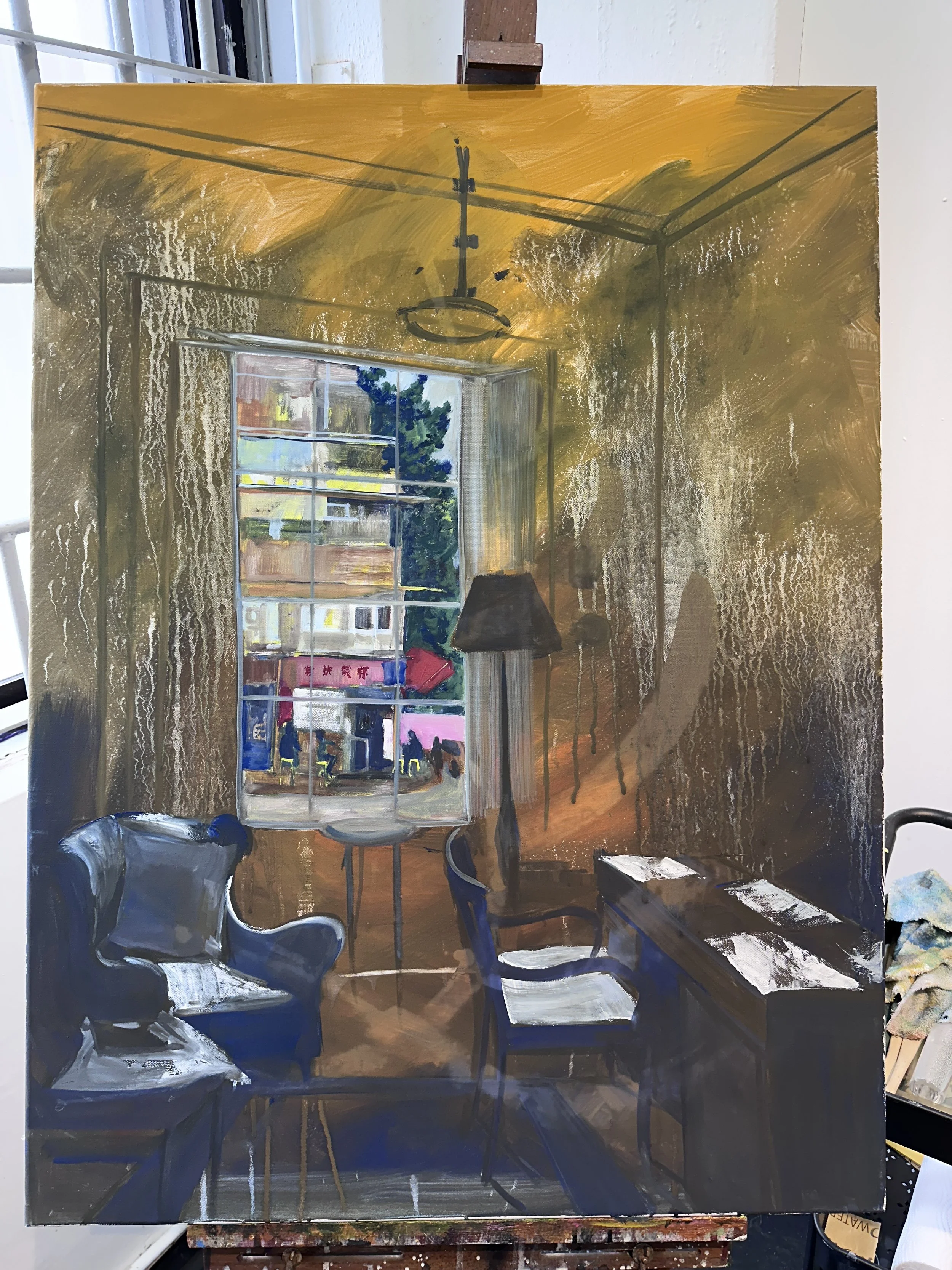 10. Another strong piece I did just because I wanted to reuse the recycled canvas that my artist friend and ex-studio mate Elaine left when she moved out. This is a strong painting in progress because I was out of my expectation boundaries, and I was painting just to try big bold strokes without initial planning. It’s based on a room in the London, and Hongkong side street cafe. I must try to let go of finishing it, and if I do decide to continue painting, I must be OK of the risks of the work being destroyed. Stay tuned for 2026 and what and where I am going to take this.