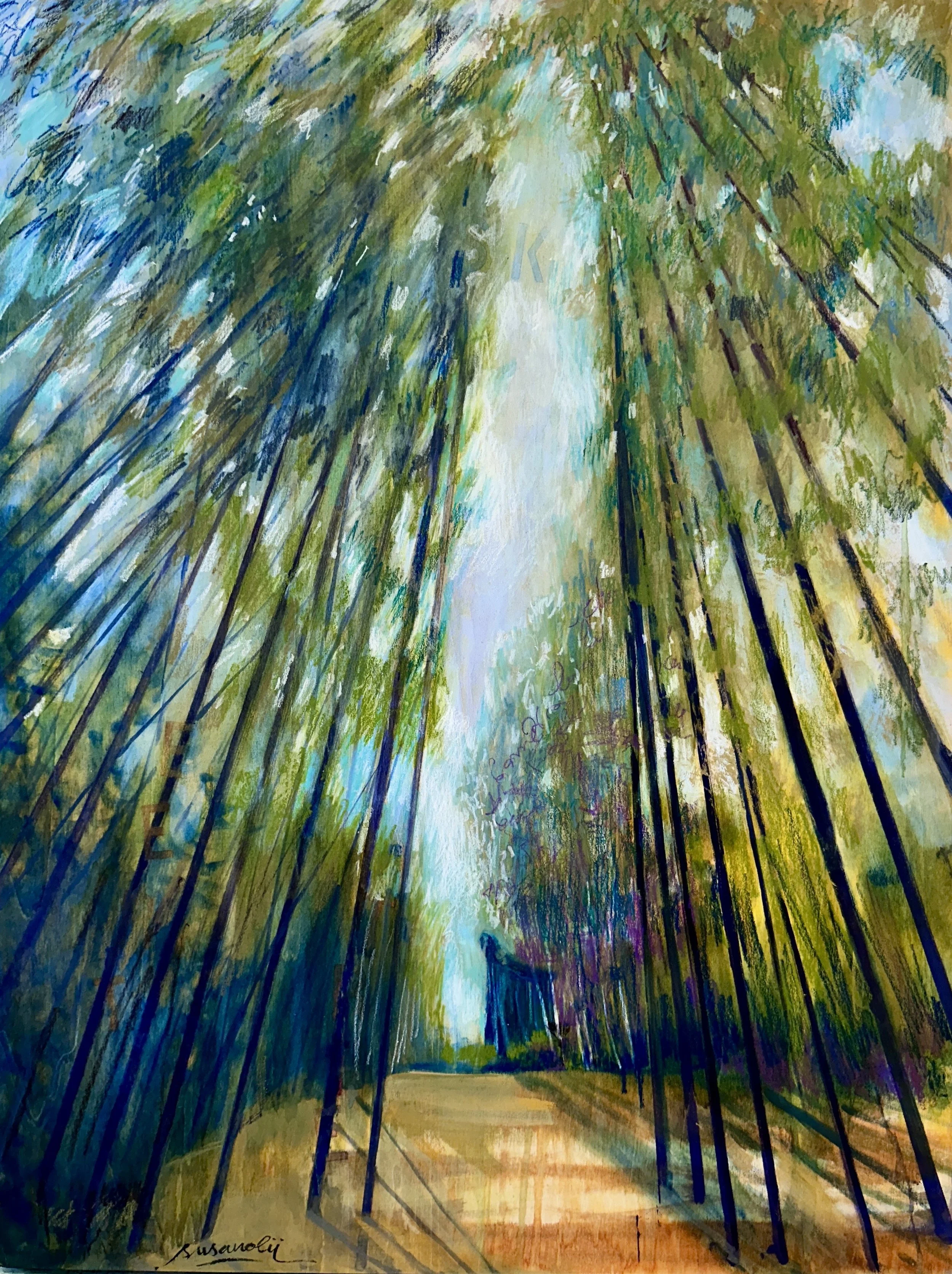 5. This piece is a return towards Shinrin Yoku, based on the imagined pieces I sold to Karen Bond. She’s got all my Shinrin Yoku pieces that i could never do again, and this is what I try to revisit, but in casein, and i added the MBS in the background very small, it’s a representation of the bold displacement I often feel when I am in Singapore that I dream of Japan, or Dalat, places non-equatorial. This is a strong painting because it represents my insistent of returning to good strong compositions and imagination.