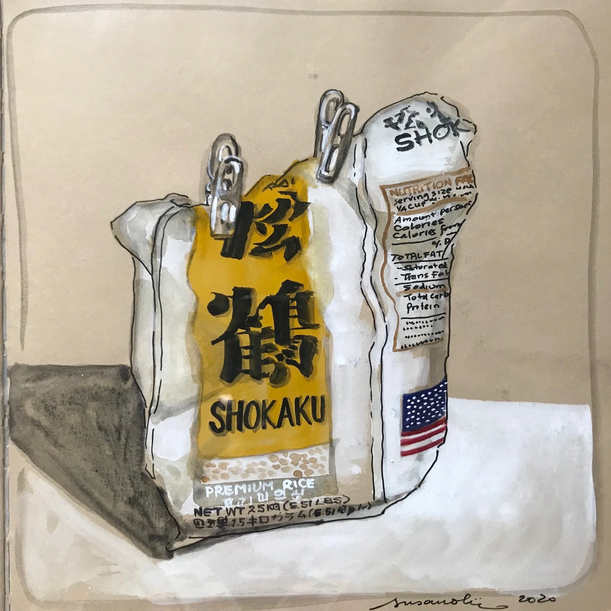Still life drawing of half a bag of Japanese rice and clips to keep it fresh.