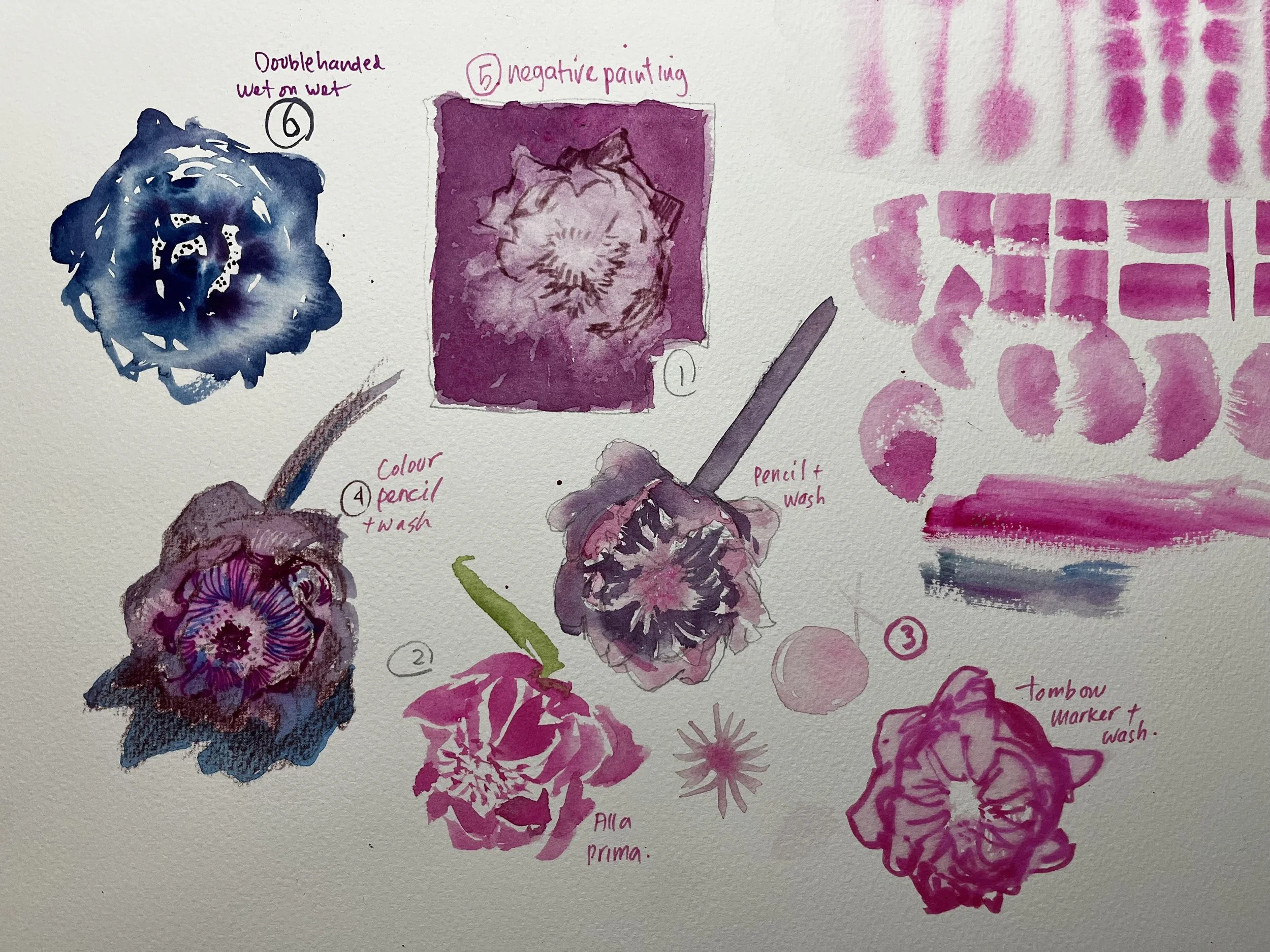 Supplied used : The paint colours are Opera Pink, Carbazole Violet and Prussian Blue. Pink Tombow marker, Burgundy pentel marker, Blackwing Pencil, Dark Red Faber Castell Polychromo pencil.