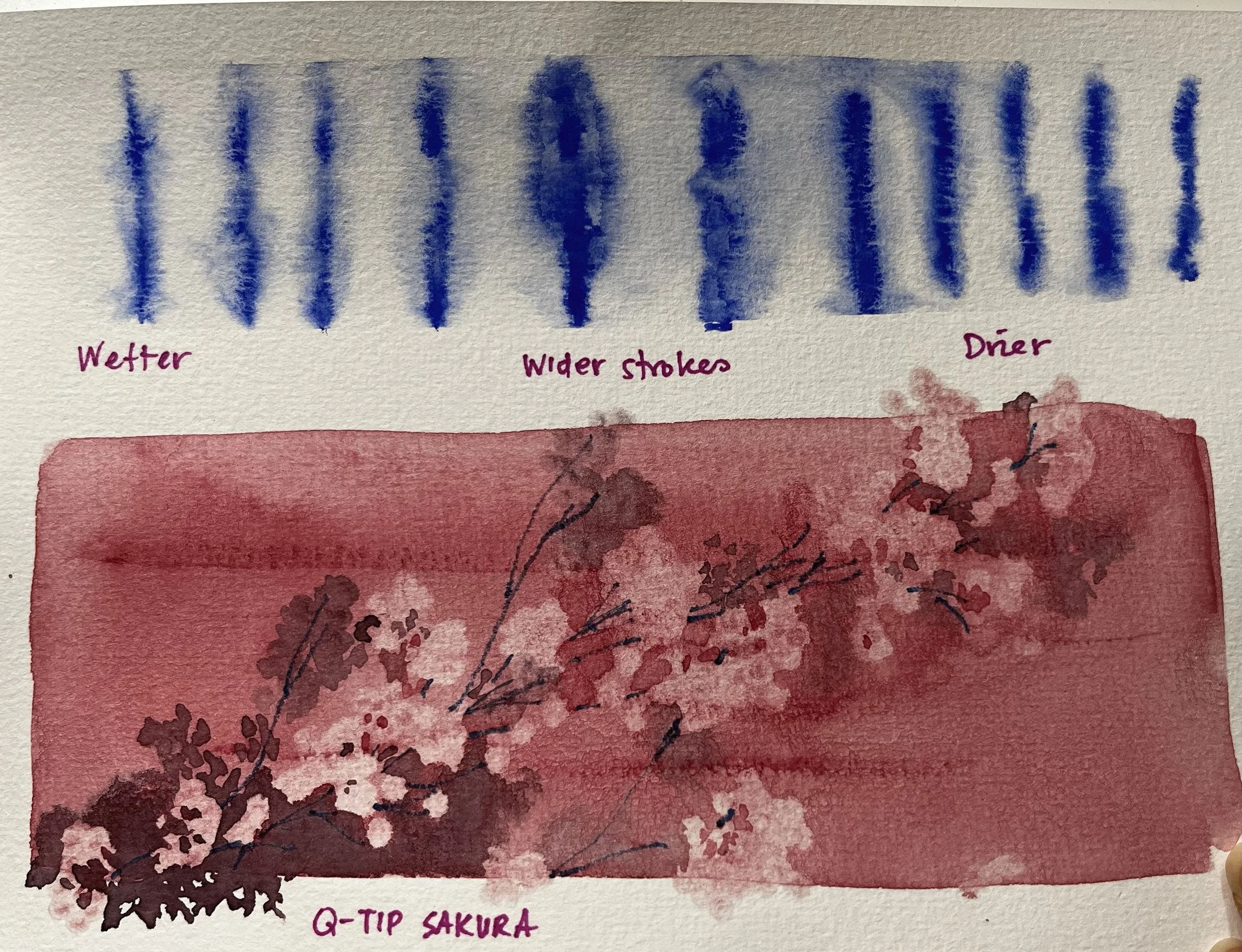And the pink thumbnail below it shows me using a q-tip to lift the sakura blossoms off the page. Watercolour paint used was Permanent Alizarin Crimson, and a little Prussian Blue, with blue colour pencil for the branch.