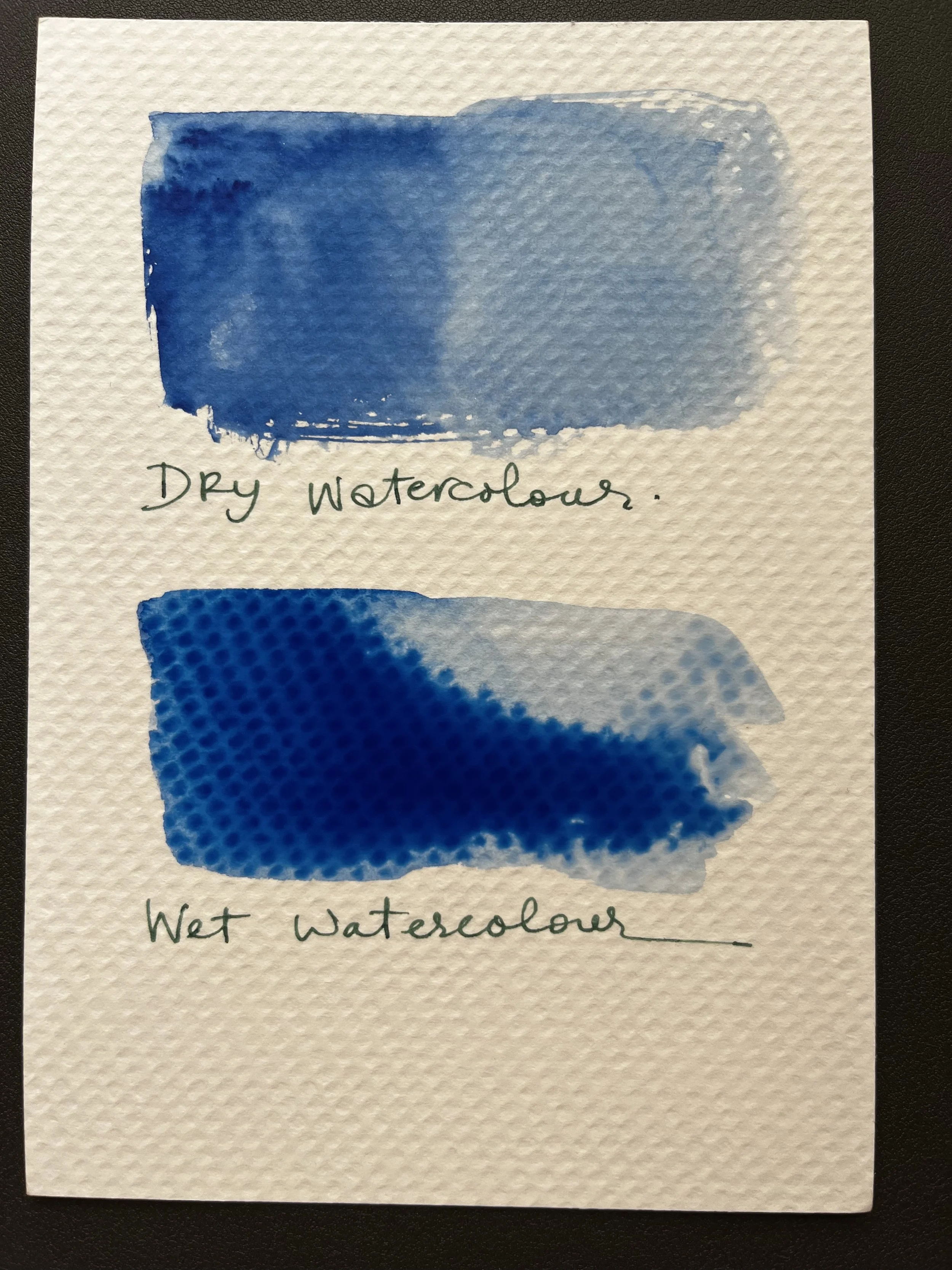 Let us look at this closely. When watercolour paint is wet and when dry, there will be a slight difference, right? Can you identify the values and the temperature difference if any, make your notes. The standard is that dry watercolour is lighter than wet watercolours, so we have to make some compensation for it to get the values we want when dry. (see pic at the bottom of this page)